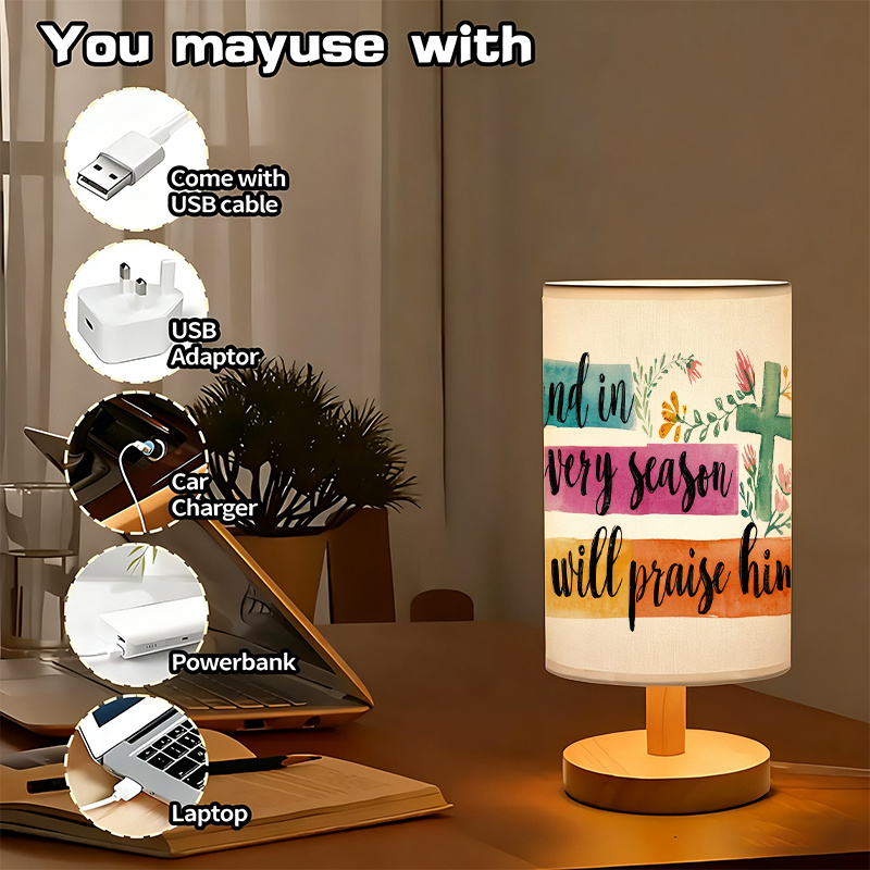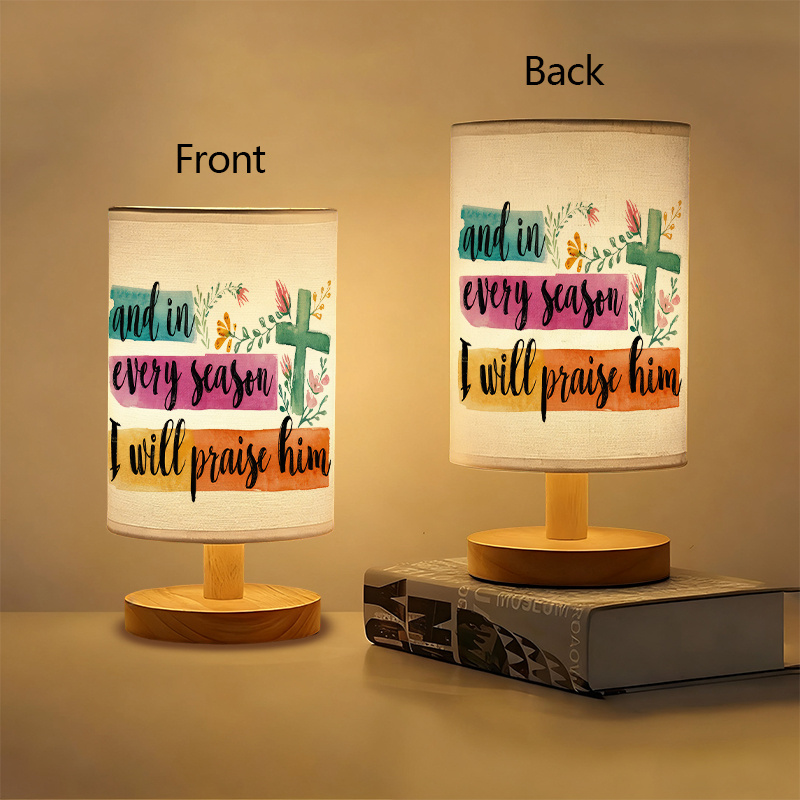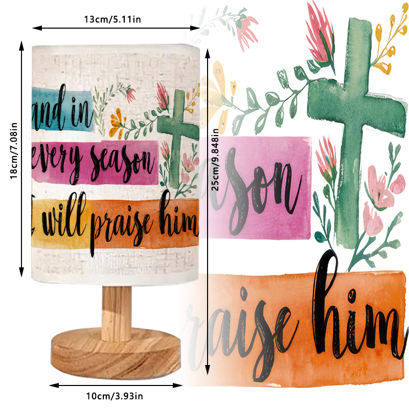 The Seasonal Praise Themed Linen Table Lamp is an indoor lighting piece designed to combine soft illumination with a meaningful printed message. The linen-style shade features faith-themed text with floral accents, creating a decorative focal point that fits well in bedrooms, living rooms, desk areas, and study spaces. Its modern form includes a wood-toned base and stem, giving the lamp a clean look that blends easily with neutral décor, light wood furniture, and simple room layouts.