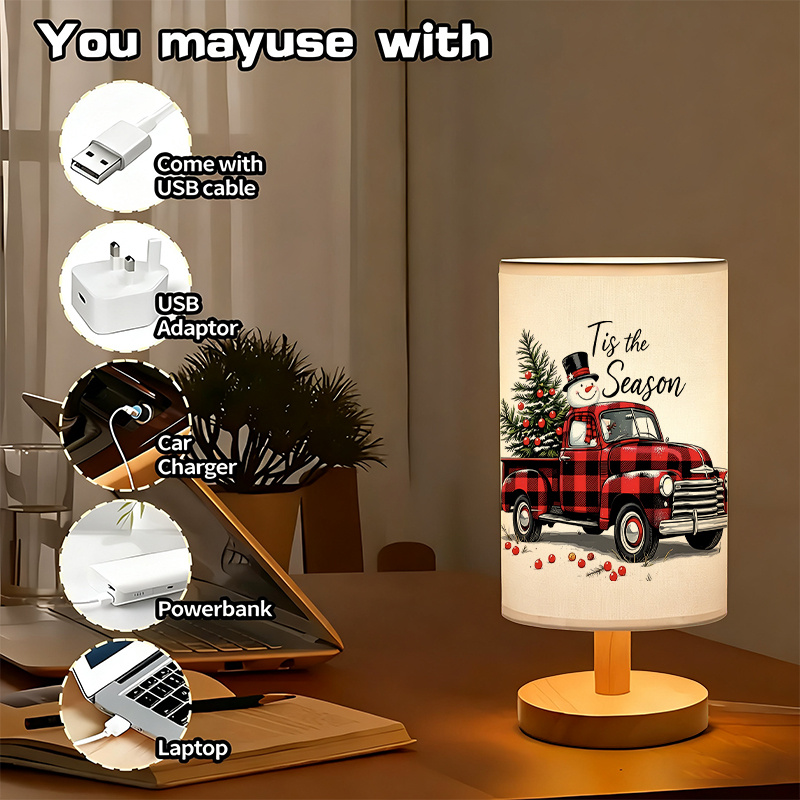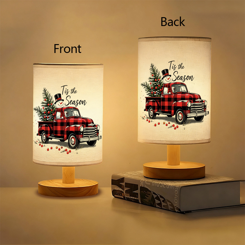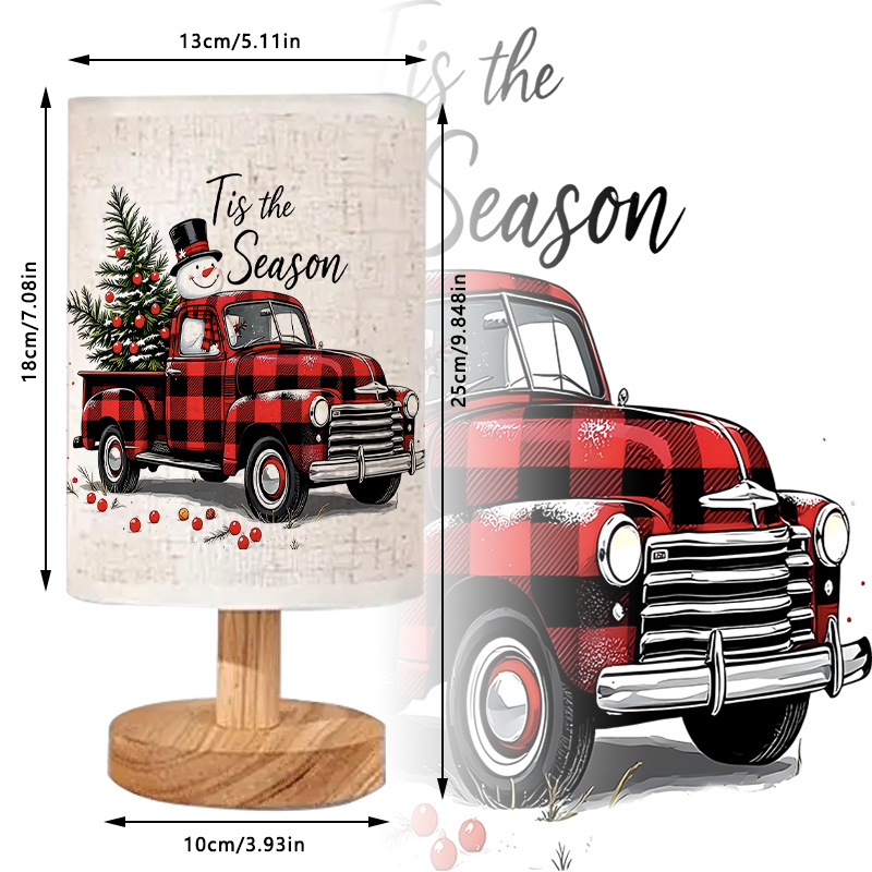 Get into the holiday spirit with the Snowman with Vintage Car Themed Christmas Linen Table Lamp. This beautifully designed lamp features a vintage red truck carrying a Christmas tree and a cheerful snowman, with the iconic message "Tis the Season." Perfect for adding a festive look to any room, this USB-powered lamp is an ideal addition to your holiday decor. Its warm and cozy lighting creates a welcoming atmosphere, making it perfect for the living room, bedroom, or any festive space. The convenience of USB power ensures that you can place it anywhere without the need for a traditional outlet. This lamp is perfect for Christmas gatherings, holiday decorations, or as a thoughtful gift.