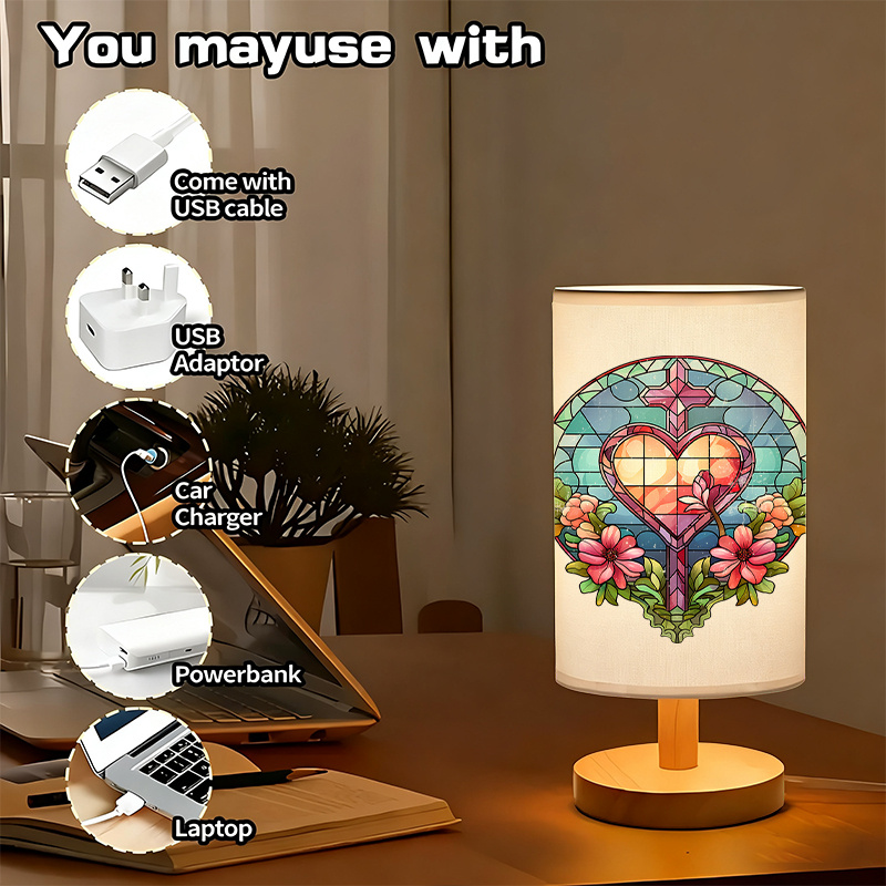 This Stained Glass Design Linen Table Lamp is designed to add spiritual meaning and calm lighting to your space. The linen shade softly diffuses light, highlighting the detailed artwork while creating a peaceful ambiance. A wooden base provides stability and a natural finish that complements the design. USB power allows flexible placement using adapters, laptops, or power banks. Ideal for bedside tables or quiet spaces, this lamp combines symbolism with everyday practicality.