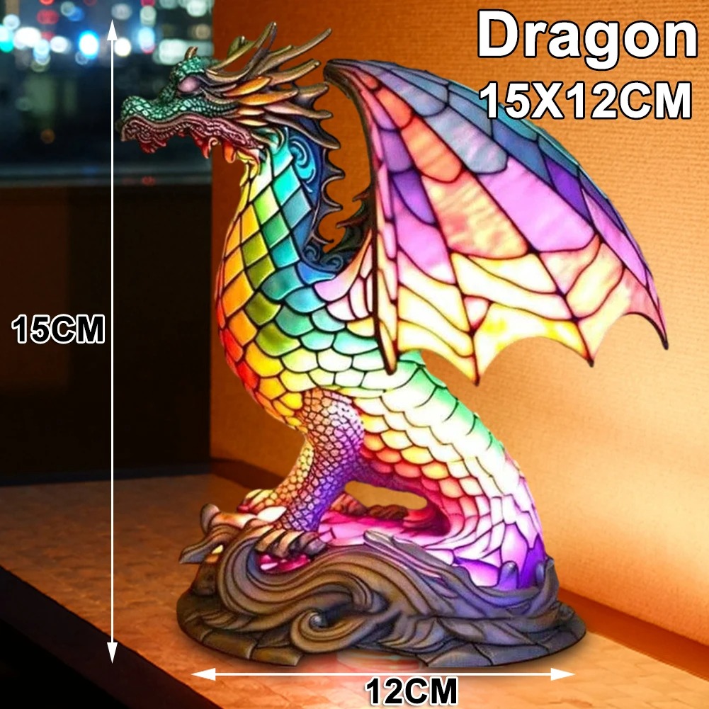 The Stained Glass Dragon Lamp is a desktop lighting piece designed for indoor spaces where accent lighting and visual detail are part of the setup. The form is based on a dragon theme and built with stained glass-style panel sections arranged in a mosaic layout. When switched on, the light passes through the segmented panels and produces a multicolor glow that changes across the surface as the viewing angle and room lighting shift.