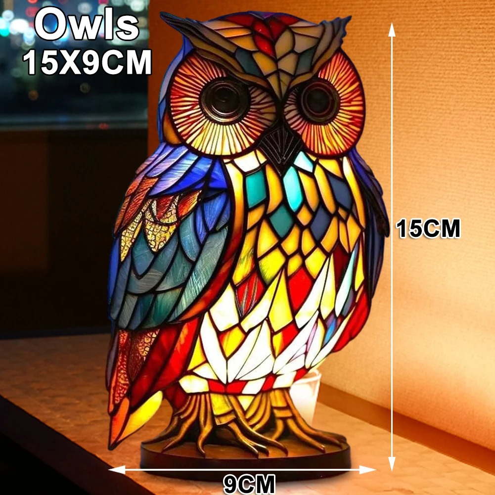 Because the bulb is included, setup is straightforward. Place the unit on a stable, flat surface near a power source, then switch it on when you want a softer lighting option than an overhead fixture. The lighting passes through the panel sections to create a warm indoor glow and a patterned look on nearby surfaces. The Stained Glass Owl Lamp is intended for indoor environments such as bedrooms, living areas, offices, reading corners, entry tables, and display cabinets.