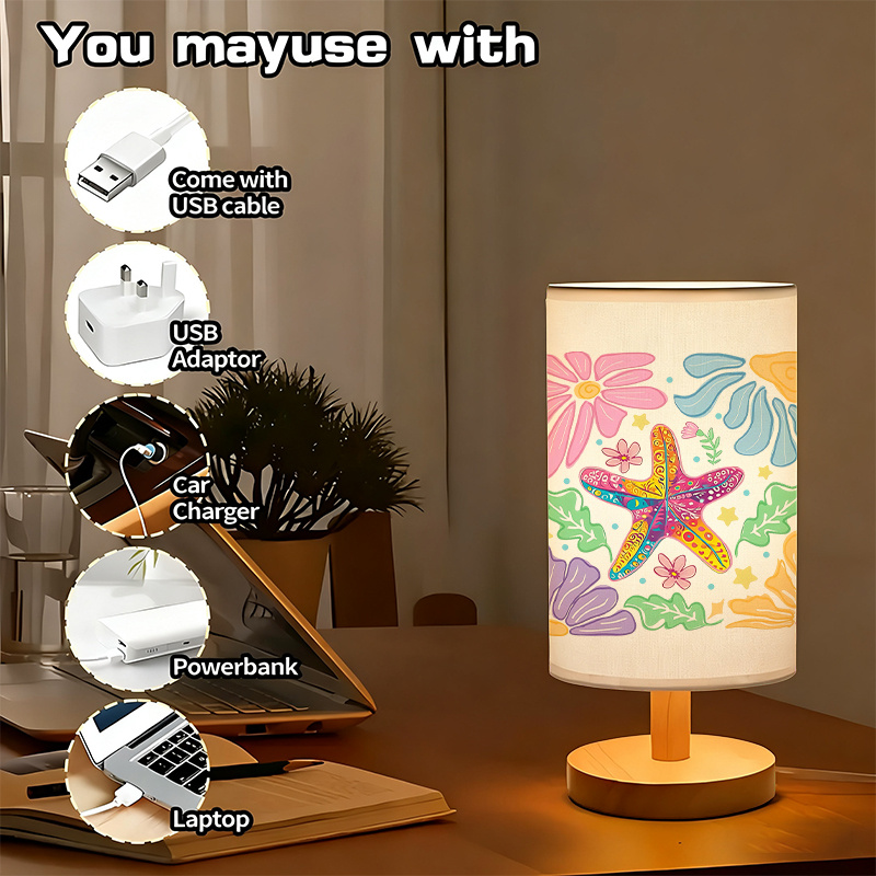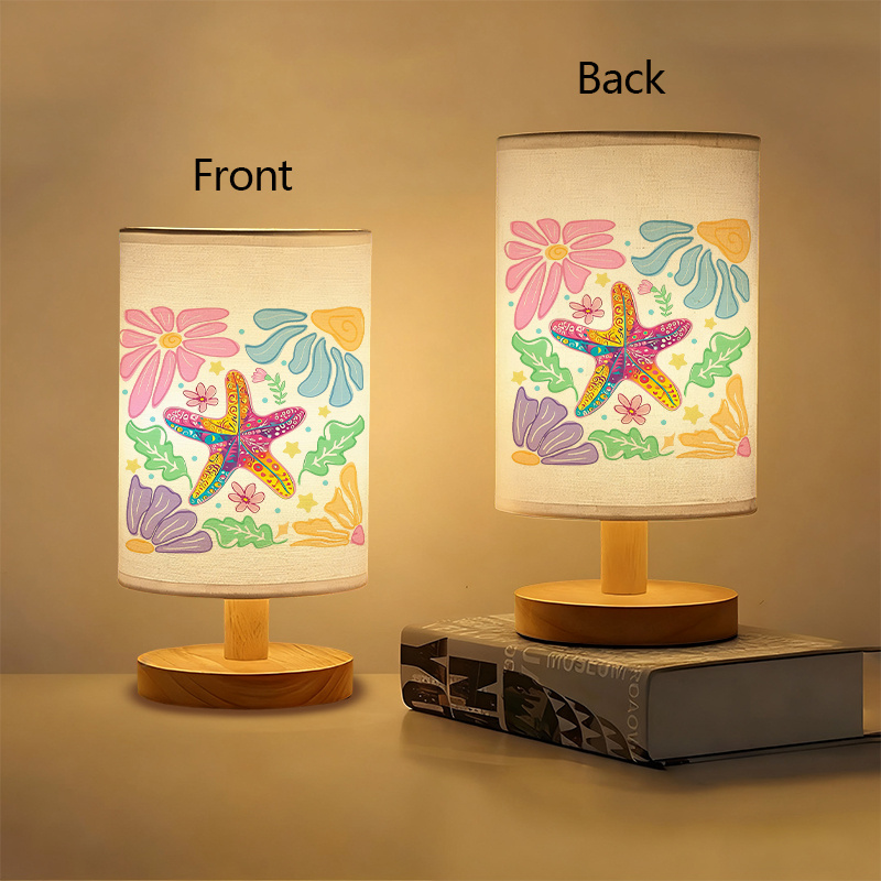 The starfish-and-floral artwork adds a nature-inspired theme without requiring additional wall décor, making it practical for smaller rooms or minimalist setups. The modern wood-toned base pairs well with common furniture finishes, including light wood, white, beige, and neutral tabletops. Push-button control supports daily on/off use with minimal effort, and the lamp does not require batteries, which helps keep upkeep simple.