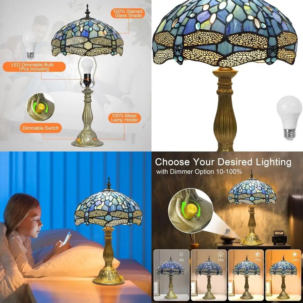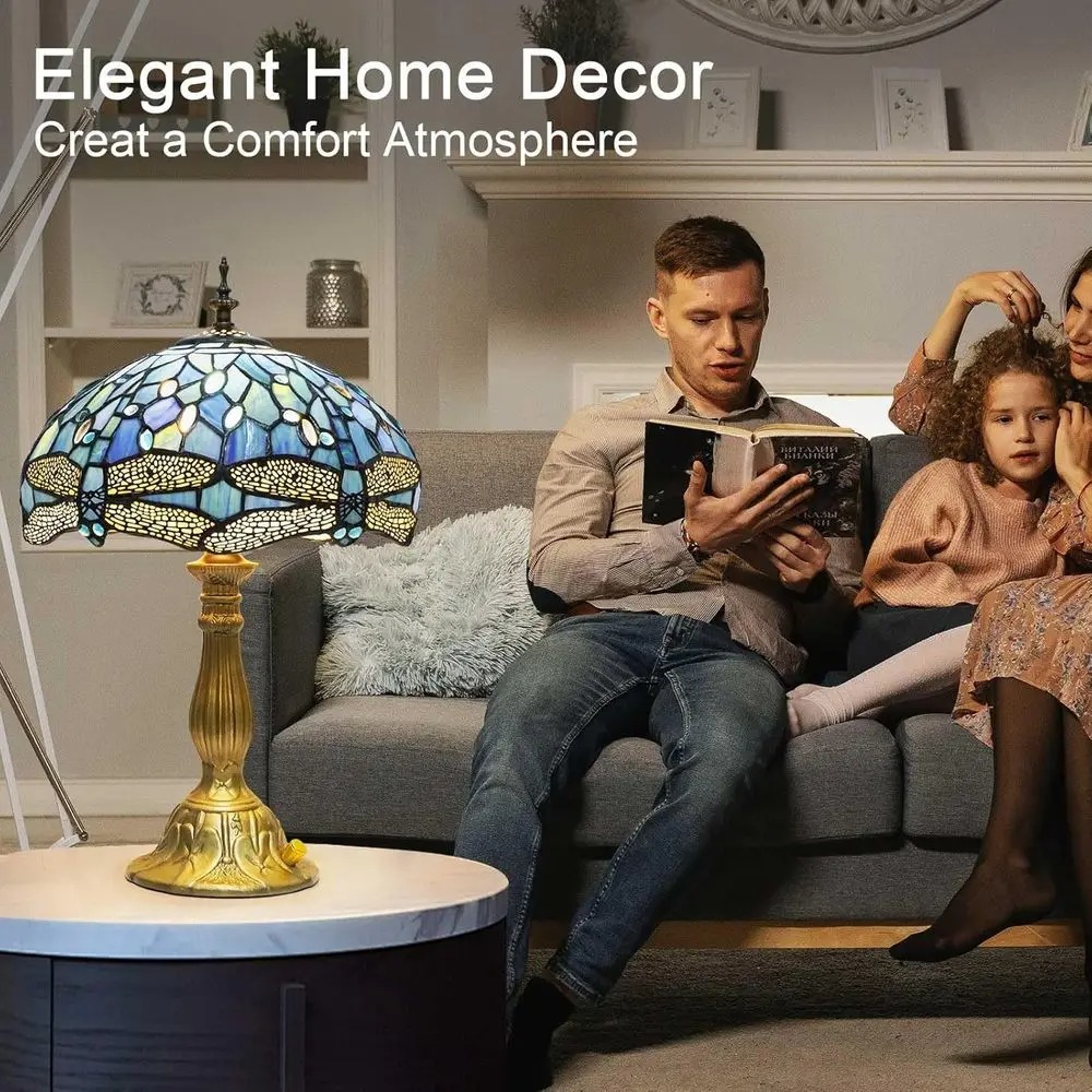 The Tiffany Dragonfly Desk Lamp is a stained glass table lamp designed for décor-focused spaces and everyday tabletop lighting. With its dragonfly-pattern stained glass shade, polished metal base, E26 compatibility, and dimmable lighting function, it works well on desks, nightstands, side tables, and display surfaces. Whether used in a bedroom, office, living room, or café-style décor setup, this lamp adds stained glass artistry and functional lighting in one decorative piece.