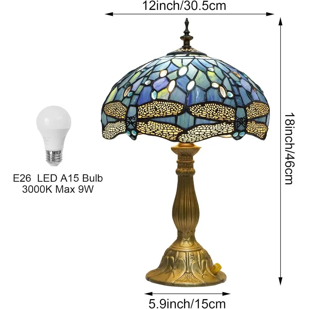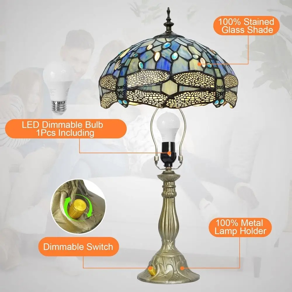 This lamp is built around a traditional Tiffany-style look, with a shade made from colored glass pieces arranged in a detailed dragonfly-inspired pattern. The glass panels are assembled to form a dome-like shade that directs light downward while also creating a glowing pattern around the lamp. The design works well in living rooms, bedrooms, offices, cafés, bars, and décor-focused spaces where lighting also serves as a display piece.