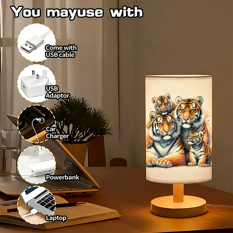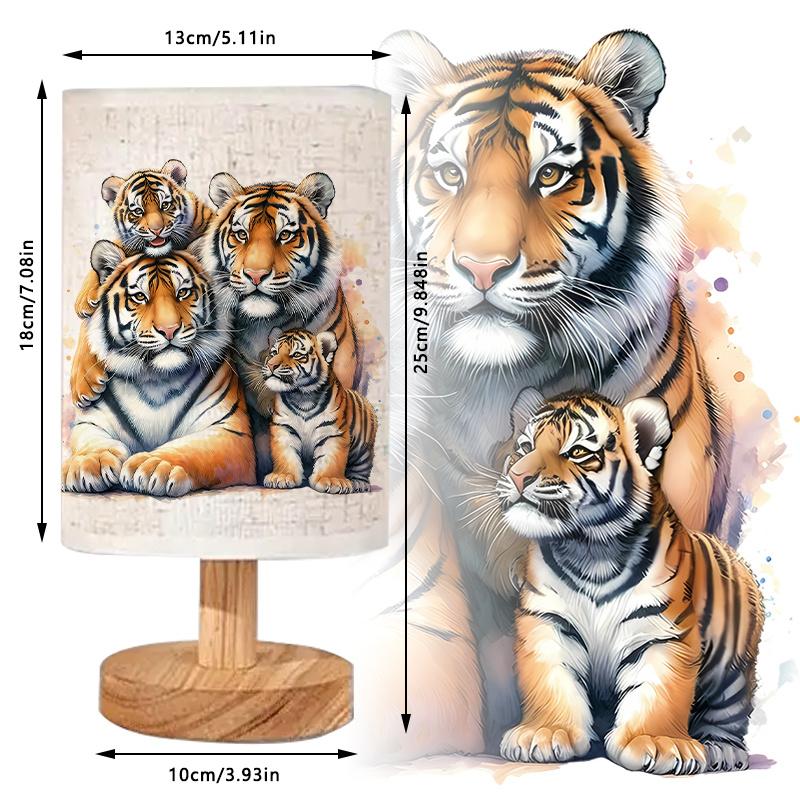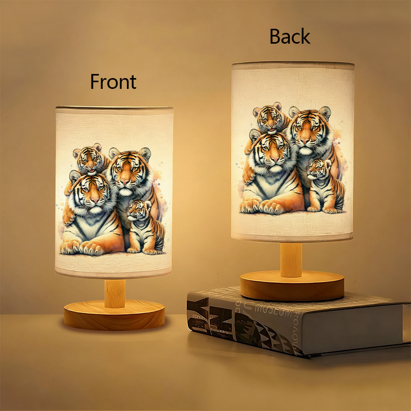 The Tiger Family Printed Linen Table Lamp is an indoor lighting accent designed to combine soft illumination with wildlife-themed artwork. The linen-style fabric shade features an illustration of a tiger family, creating a nature-inspired focal point that adds character to bedrooms, living rooms, desk areas, and reading corners. The design shows multiple tigers together in a warm, detailed art style, making the shade look like a framed print when the lamp is off and a softly lit display when turned on. With a modern cylindrical shade and a wood-toned base, the lamp fits naturally with many interiors, including neutral décor, wood furniture, and simple room layouts.