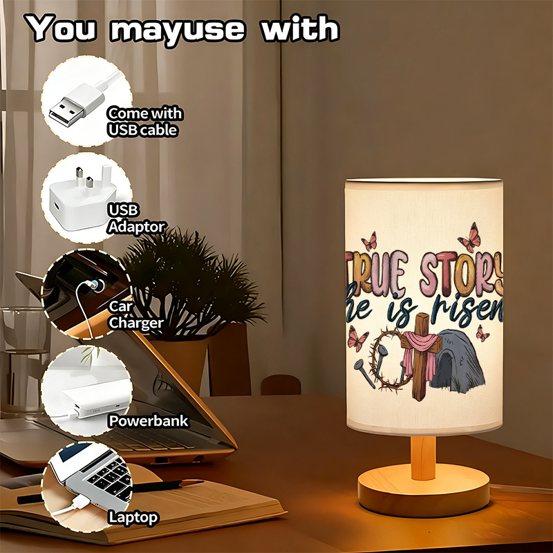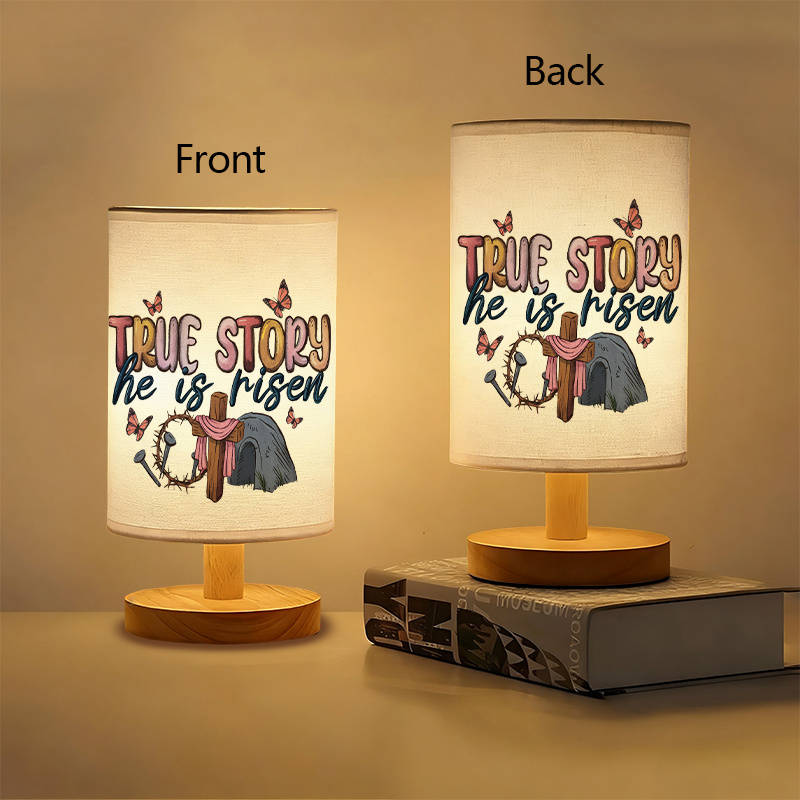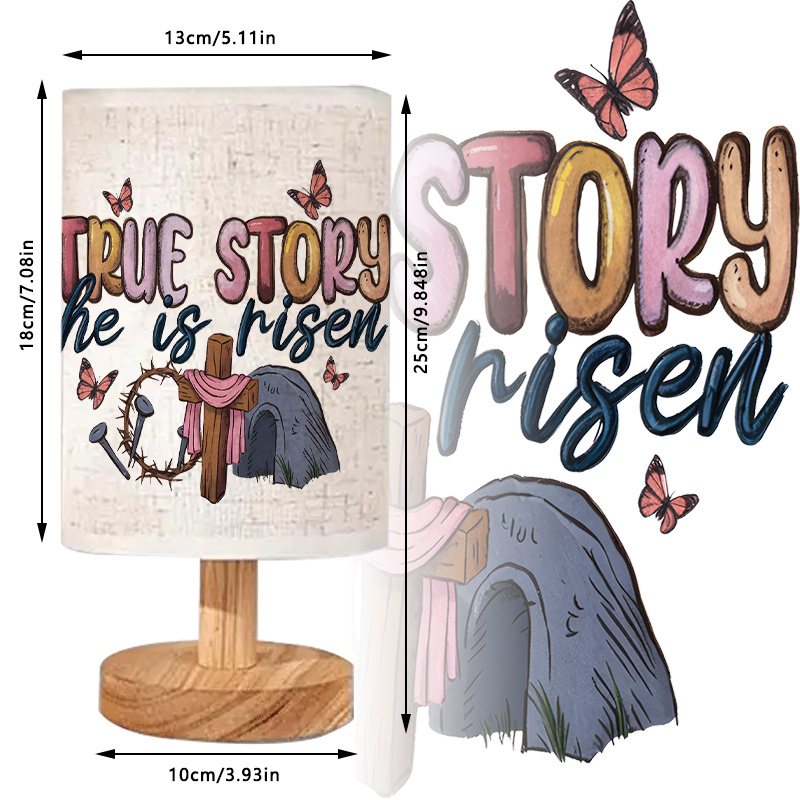 The True Story He Is Risen Inspirational Message Printed Table Lamp With Butterfly Artwork brings message-focused decor into indoor spaces. Designed with a printed lampshade and wooden base, this lamp supports quiet spaces such as desks, side tables, and room corners. Featuring artwork with symbolic references and a printed message, the lamp functions as a reading or ambient light source.
