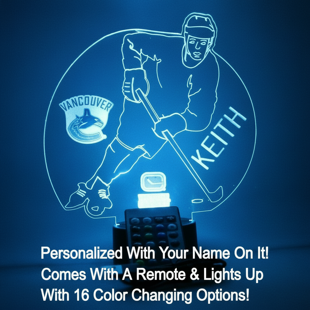 The Vancouver Canucks Hockey Player Shaped 3D LED Lamp offers an engraved acrylic player design paired with a custom name in a compact LED display format. Designed for indoor spaces, it fits easily on desks, shelves, or tables while providing a clear illuminated outline. With simple setup and basic care, this lamp serves as a personalized addition to sports-focused décor.