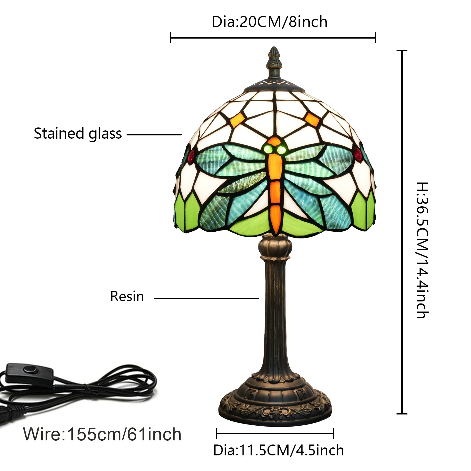 - Cleaning: To preserve the beauty of the stained glass, use a soft, dry cloth to wipe the lamp shade. Avoid using harsh chemicals or abrasive materials that could damage the glass. The resin base can be cleaned with a damp cloth, but ensure it is not soaked in water.