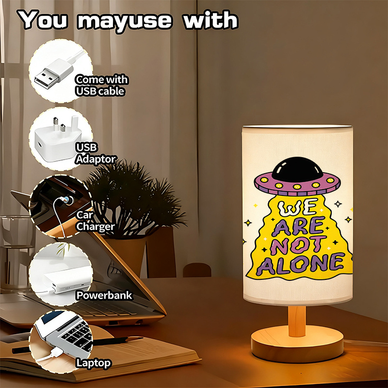 The We Are Not Alone Printed Linen Table Lamp stands out for its design and modern usability. The linen shade softens the light, making it comfortable for nighttime use. USB power adds flexibility, allowing placement almost anywhere without complicated wiring. The UFO artwork sparks curiosity and conversation, making it more than just a lamp—it’s a décor statement. With its compact size, sturdy wooden base, and creative theme, this lamp is perfect for anyone who enjoys imaginative and expressive home décor.