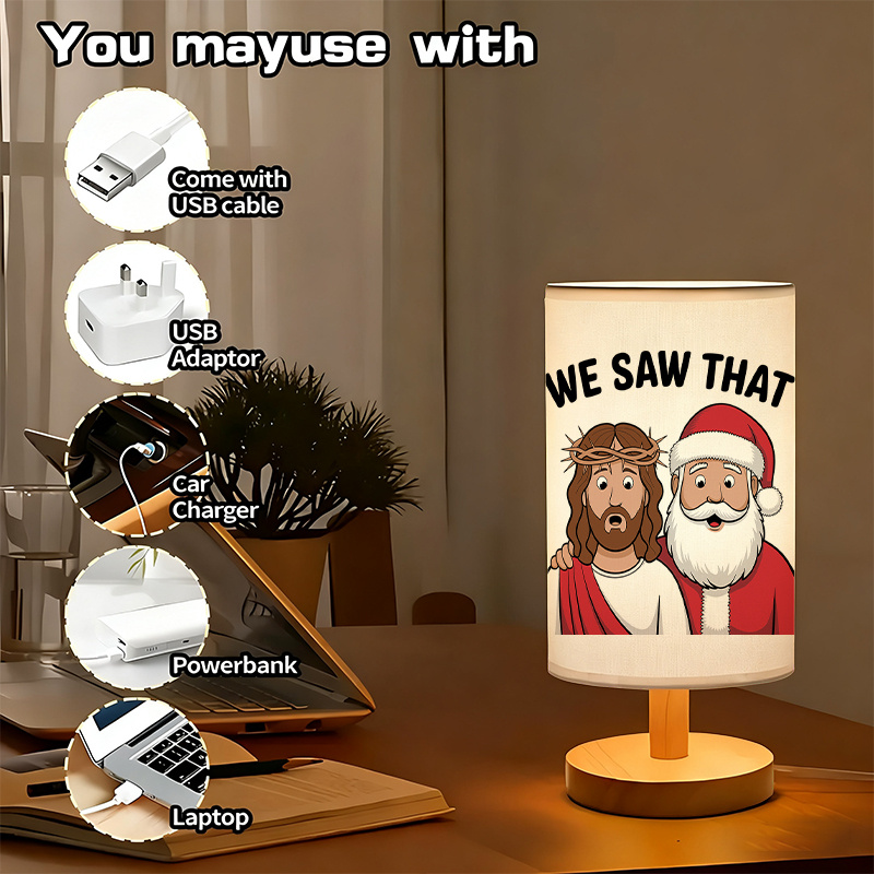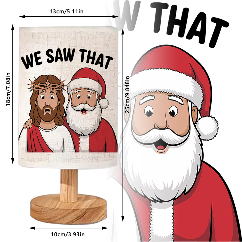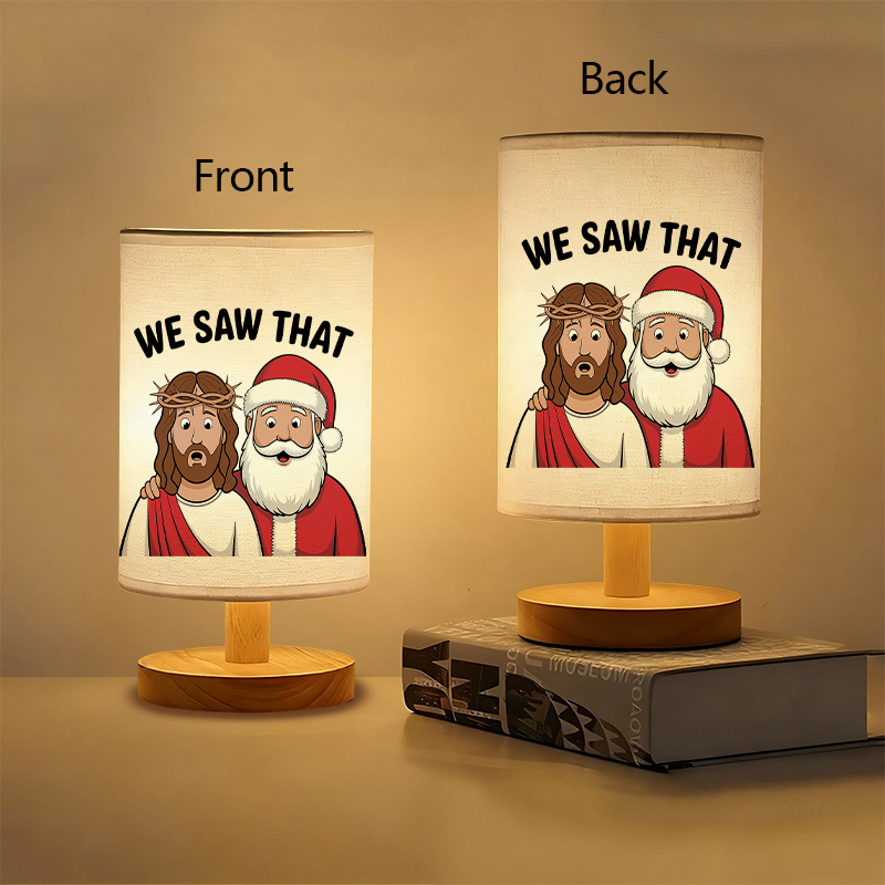 The We Saw That Printed Linen Bedside Table Lamp is a decorative lighting piece designed to combine seasonal humor with spiritual symbolism. Featuring an illustrated design of Jesus and Santa with the phrase “We Saw That,” this lamp presents a thoughtful and lighthearted message suitable for holiday décor. The artwork is printed on a linen-style fabric shade, allowing the design to softly appear when illuminated.