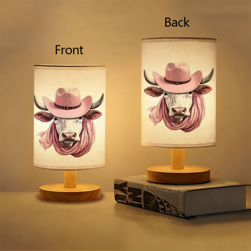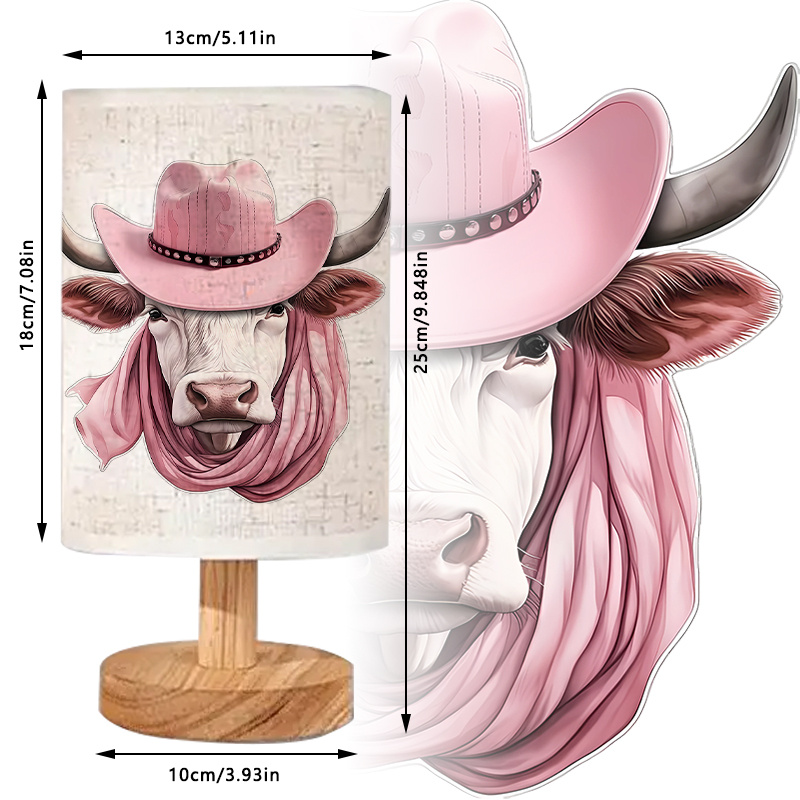 Bring character into any indoor space with the Western Cow Themed Table Lamp With Hat And Wooden Base, designed with a rustic theme. This structured accent piece stands as a nod to western styling, blending natural materials with farm-inspired artwork. It creates a focal point on side tables, desks, and small shelves rustic theme.