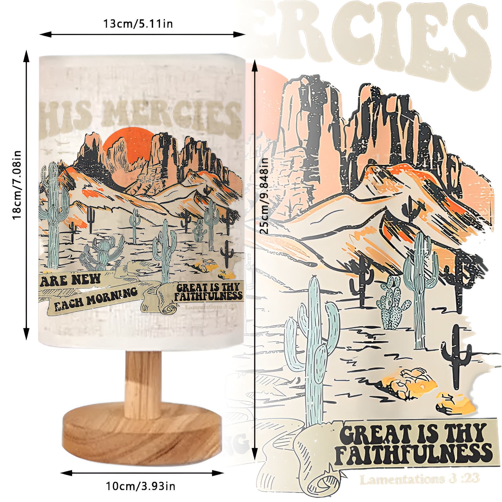 This lamp is also a good match for décor themes inspired by travel, the outdoors, and western landscapes. The desert scene can complement rustic décor, natural textures, and neutral furniture. Use it in a reading corner near a chair, on a shelf as part of a display arrangement, or on a console table in an entryway to create a warm focal point. It can also be used as a décor gift for people who enjoy scenic artwork or western-inspired home styling.