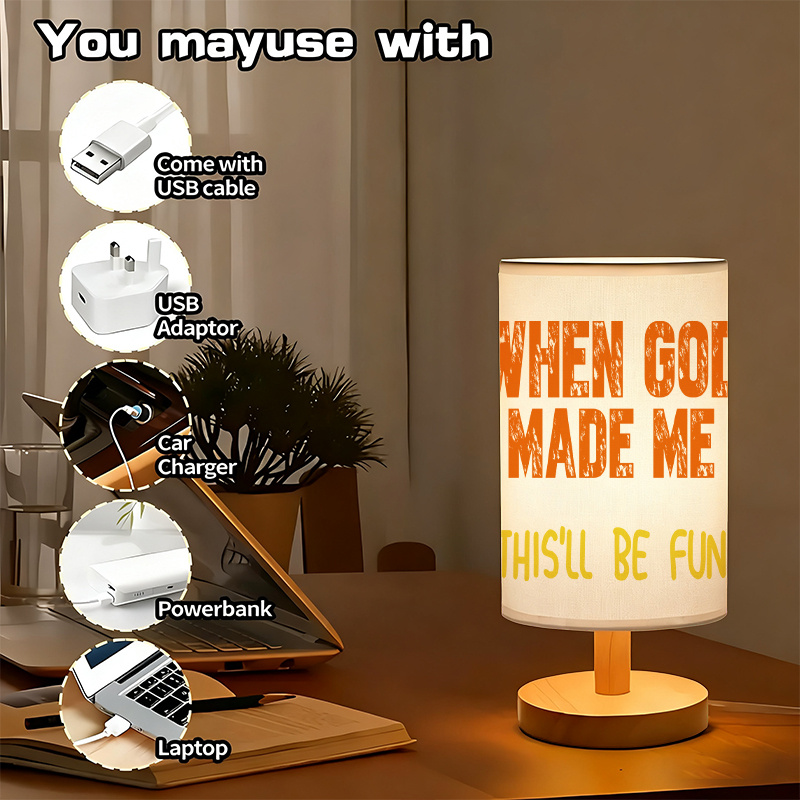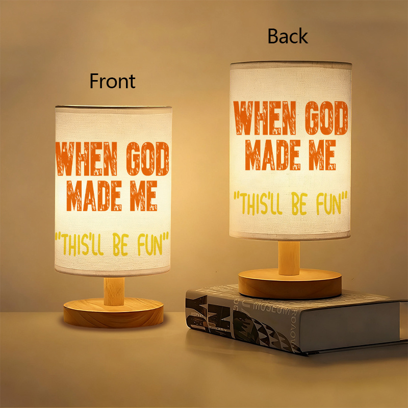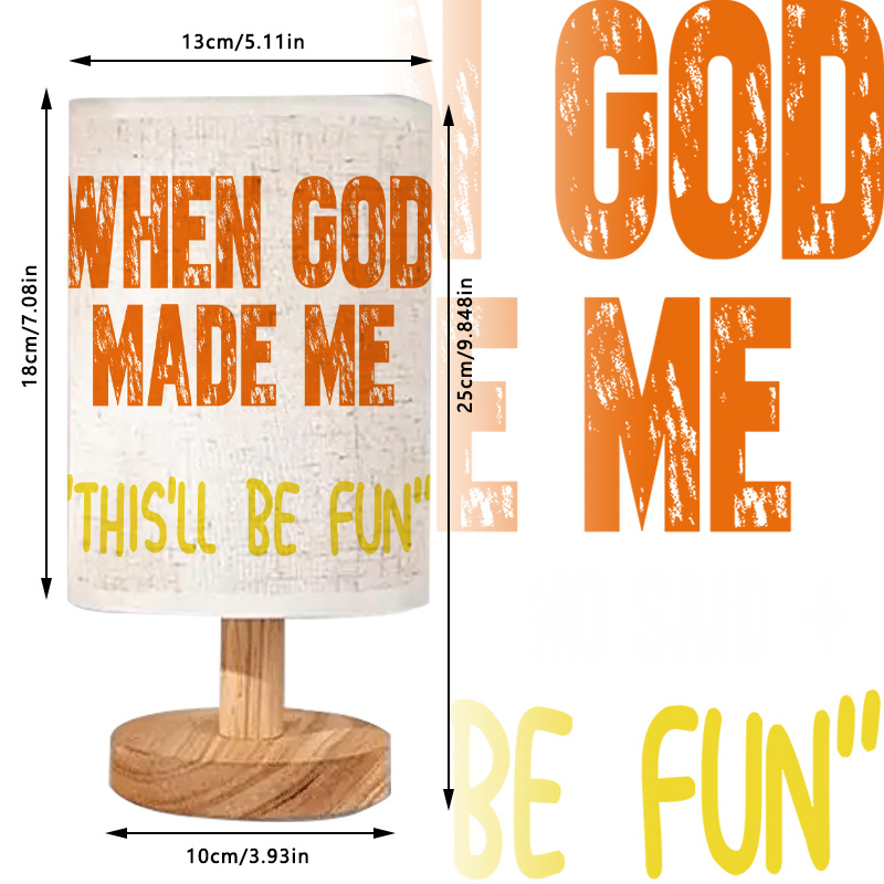 Its construction combines a fabric-textured shade with a cylindrical shape and a smooth wood base. Measuring approximately 18 cm in height, it fits compact setups where larger items may not be suitable. The printed quote reads “When God Made Me ‘This’ll Be Fun,’” creating a tone that reflects purpose and intentionality.