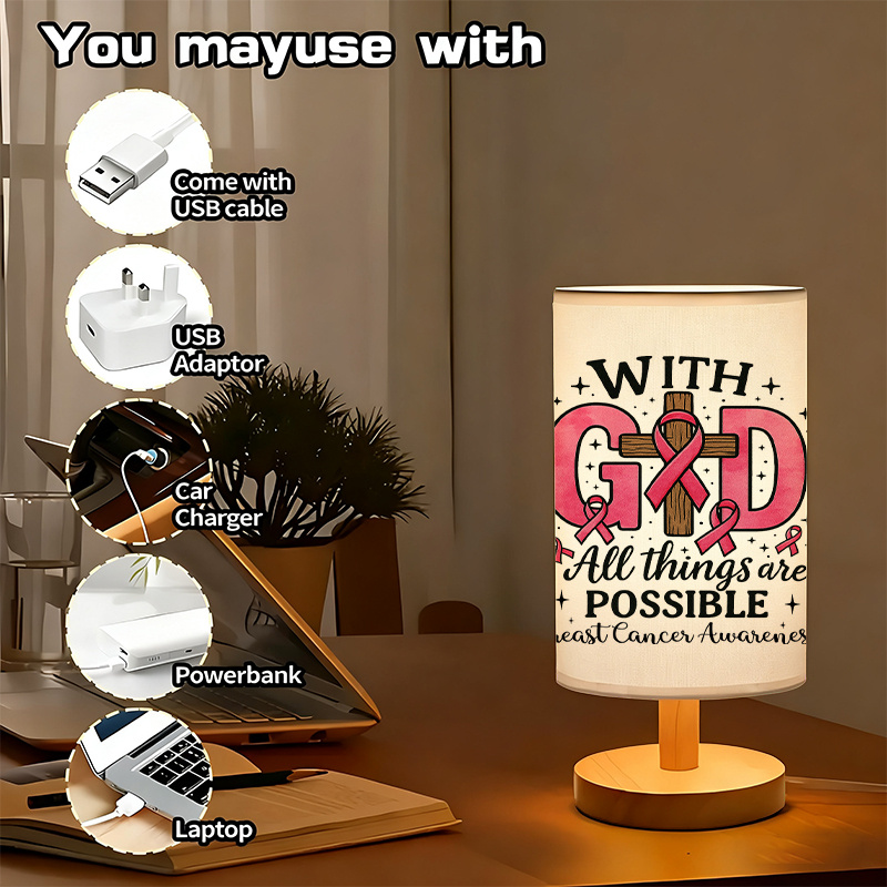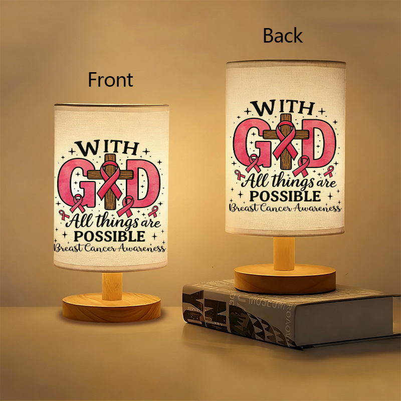 The With God All Things Are Possible Faith Quote Printed Linen Table Lamp is created for seasonal settings that favor warm lighting, thematic design, and structured materials. This lamp features a cylindrical printed shade and a balanced wood base, designed to remain upright and functional across various spaces.